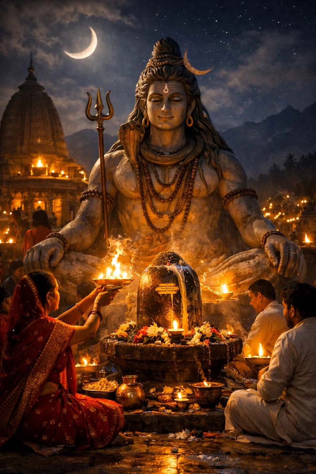 महाशिवरात्रि 2026 पर रात्रि जागरण के दौरान शिवलिंग का अभिषेक और भगवान शिव की पूजा करते भक्त। Photo Source : AI