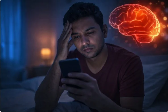 मोबाइल एडिक्शन कैसे दिमाग को नुकसान पहुंचाता है? जानिए देर रात Screen Time, Blue Light और Brain Health से जुड़े खतरे व बचाव के उपाय।