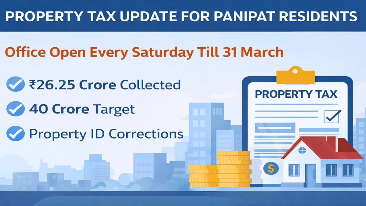 Panipat में Property Tax जमा करने वालों को बड़ी राहत मिली है। नगर निगम ने 31 मार्च तक हर Saturday को भी Property Tax Branch खोलने का फैसला किया है। अभी तक 26.25 करोड़ रुपये टैक्स जमा हो चुका है, जबकि निगम ने 40 करोड़ रुपये का target रखा है। साथ ही Property ID की गलतियां भी ठीक की जाएंगी।