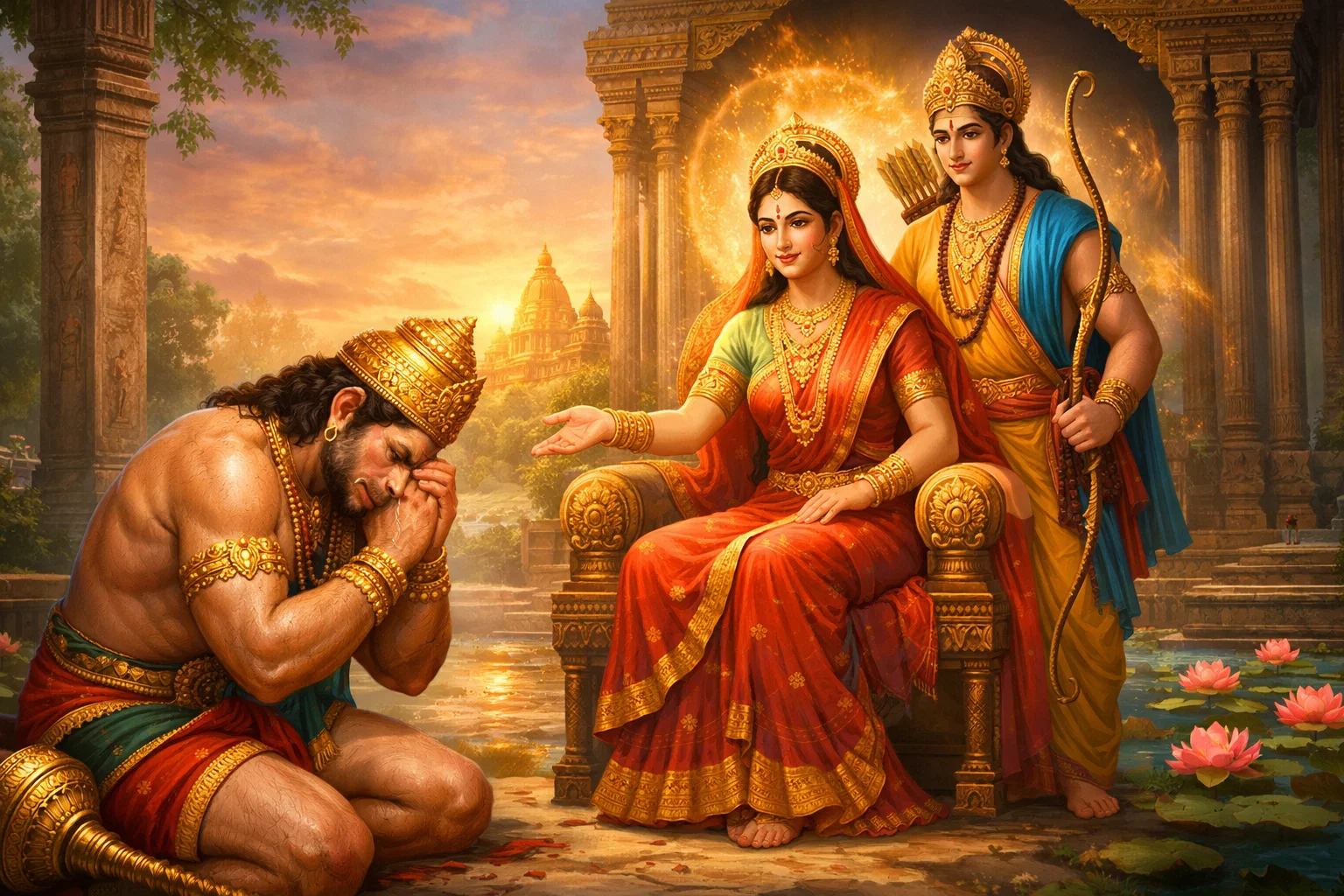अमरत्व का वरदान लौटाते हनुमान जी, माता सीता और प्रभु श्रीराम। Photo Source AI